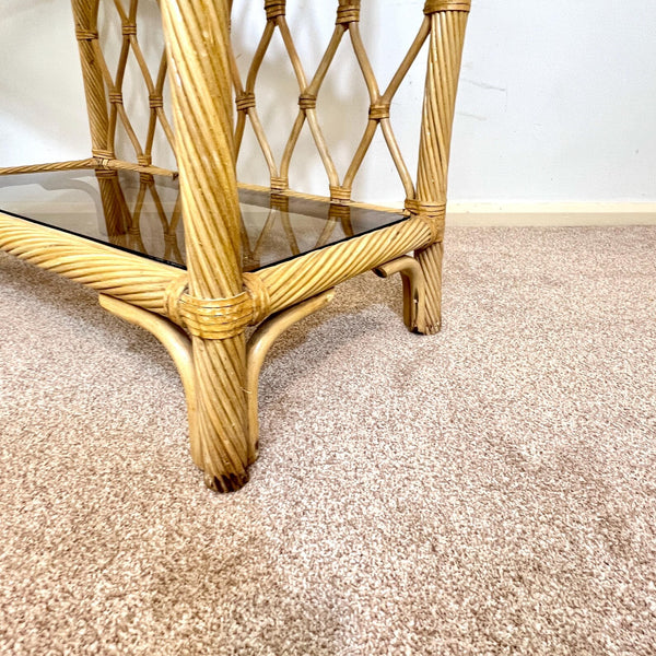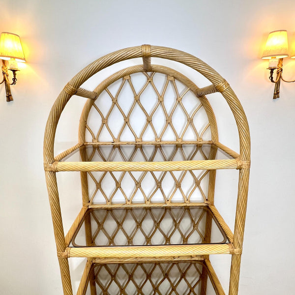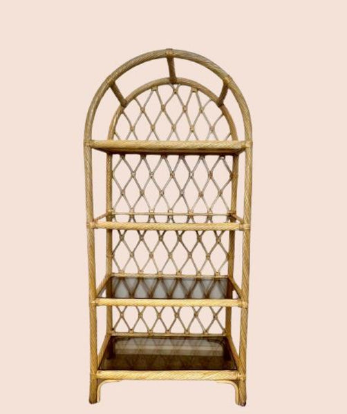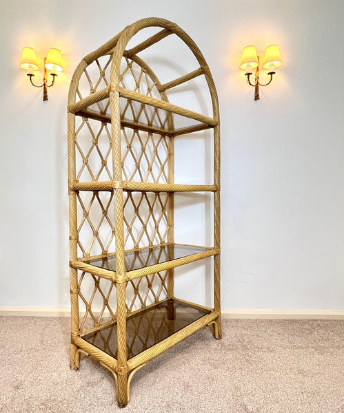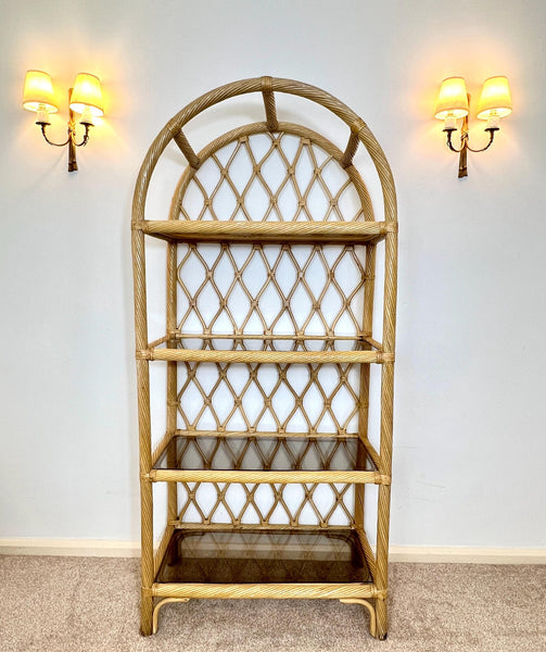 That arched top is what makes it. Where a flat-topped bookcase just stops, this one finishes with a beautiful cathedral curve that draws your eye upward and makes the room feel taller. Diamond lattice rattan back, twisted cane frame, and four smoked glass shelves that seem to float inside the structure.