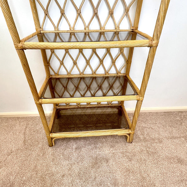 Good vintage condition throughout. Solid frame, tight joints, no loose cane. Glass shelves are all intact with no chips or cracks.